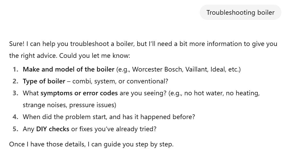 ChatGPT asked all the right questions about my heating setup — including the boiler’s make and model — and helped narrow down the likely causes. Because I was up for some DIY, it even walked me through safe troubleshooting steps.